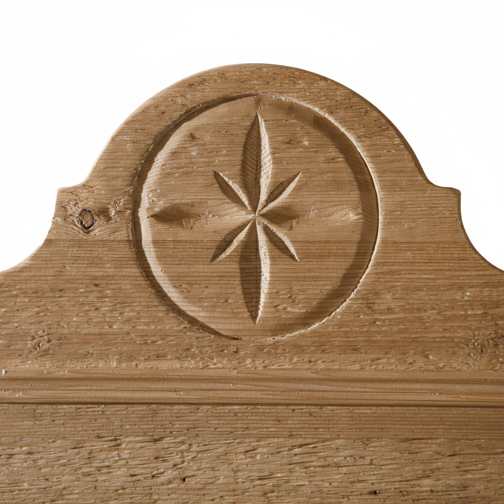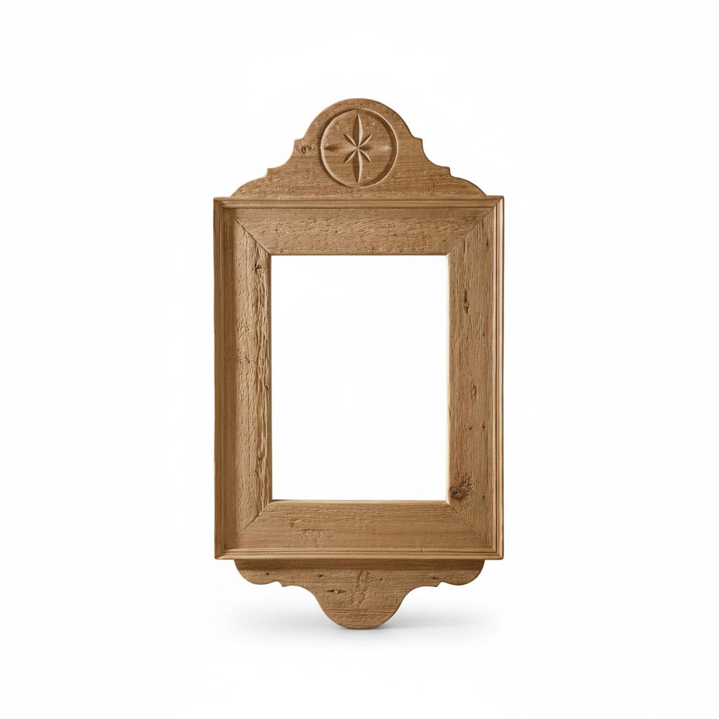 The frame is enriched with hand-carved Alpine motifs, featuring a characteristic carved rosette detail on the upper crest and subtly shaped contours that reflect classic mountain design. Its structured frame and decorative top element create a strong visual presence while maintaining balanced proportions.