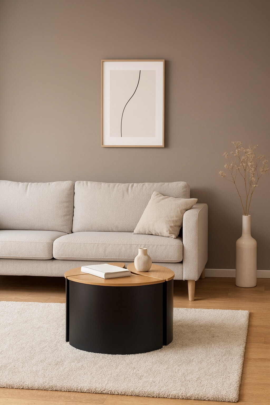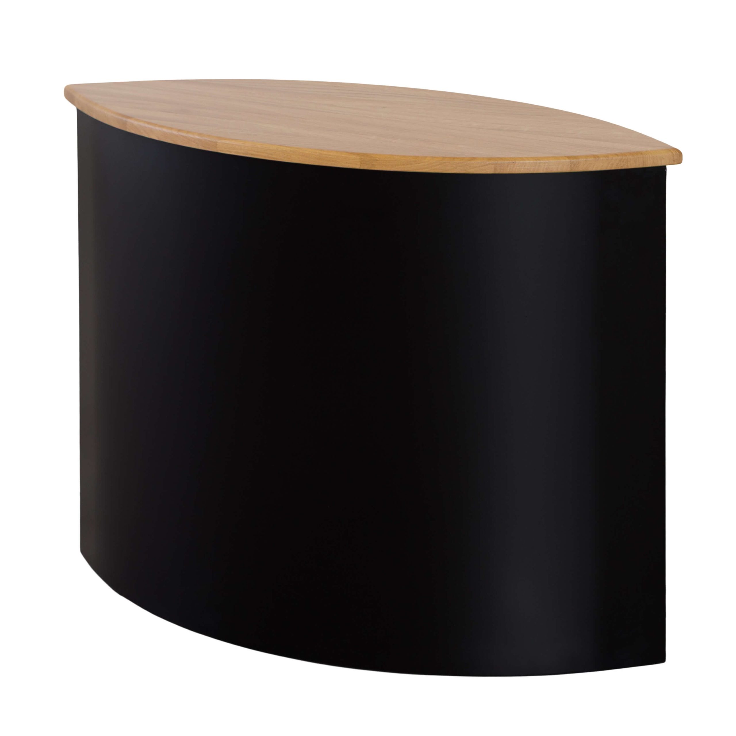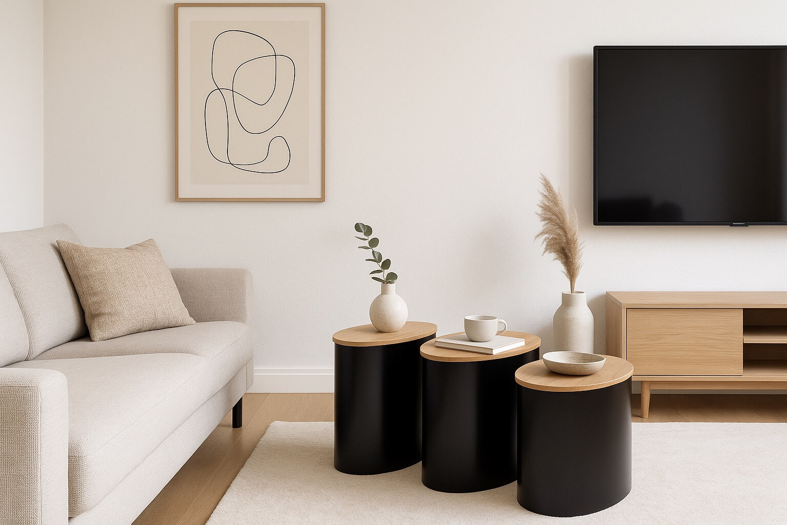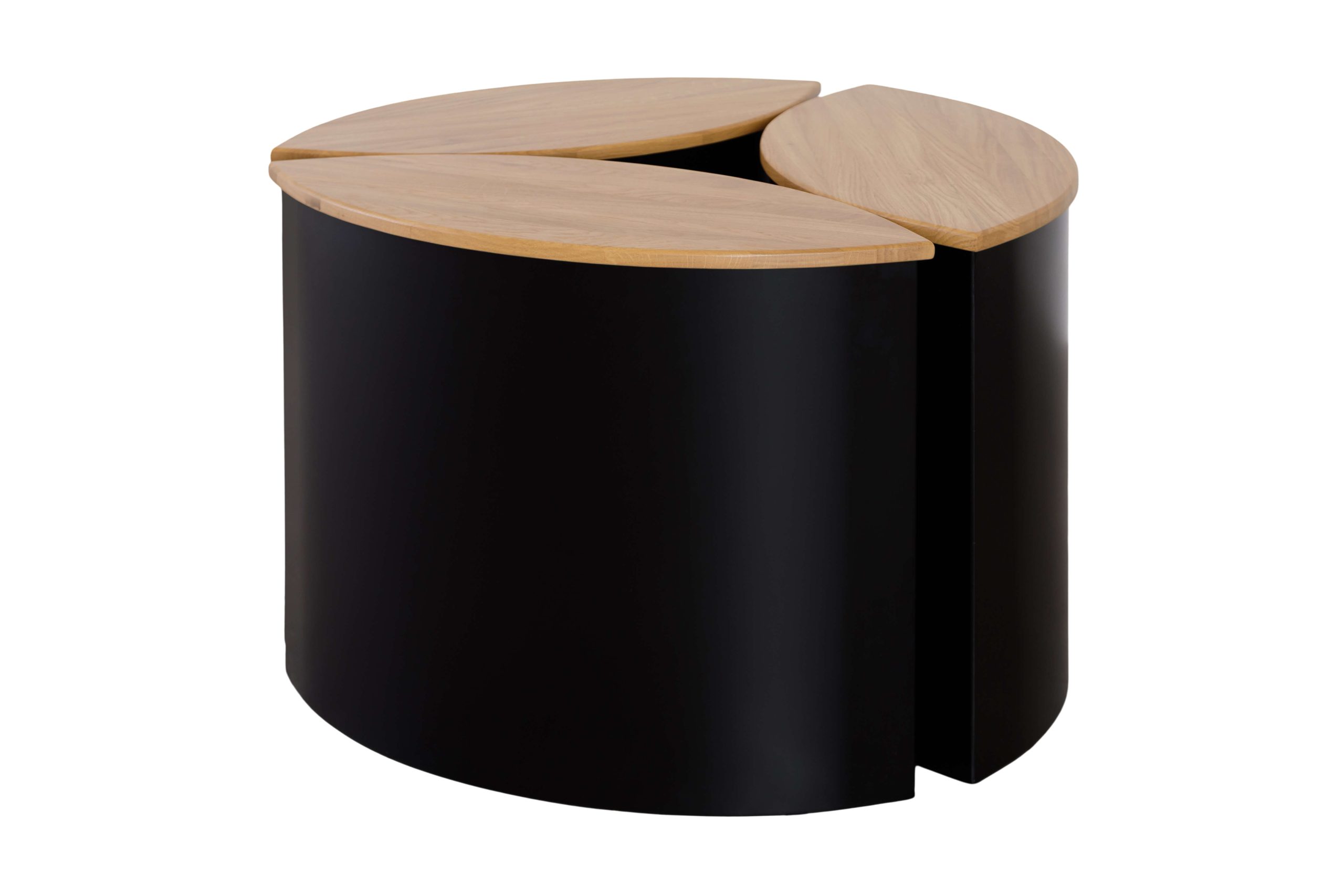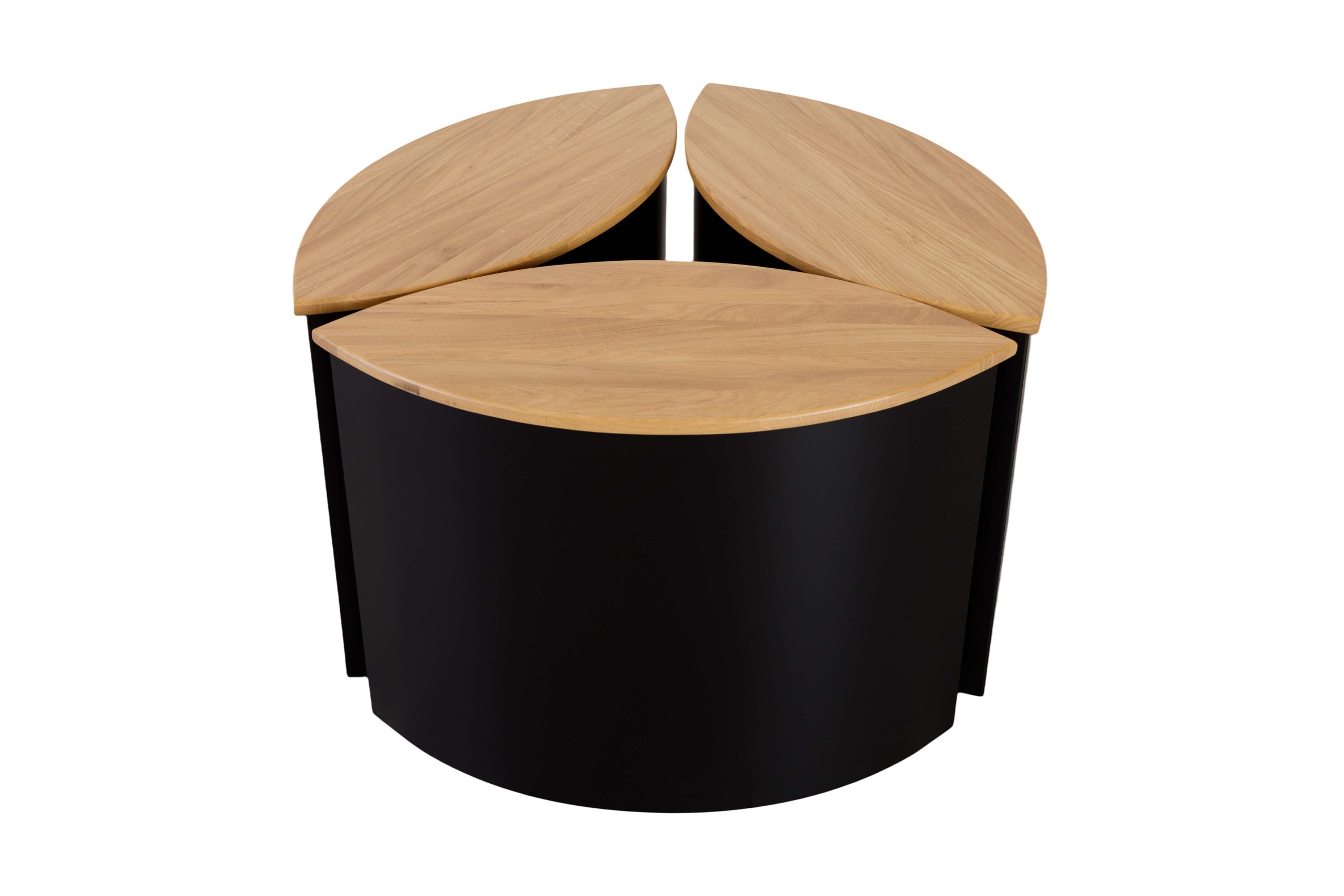 This modular coffee table set combines modern elegance with clever functionality. Each piece features a solid oak top and a sleek black metal base with a distinctive curved shape. The three individual tables can be used separately or joined together to form a stylish circular centerpiece. The natural wood surface adds warmth to the minimalist design, while the matte black finish gives it a refined, contemporary edge. Perfect for living rooms that value both design and versatility.