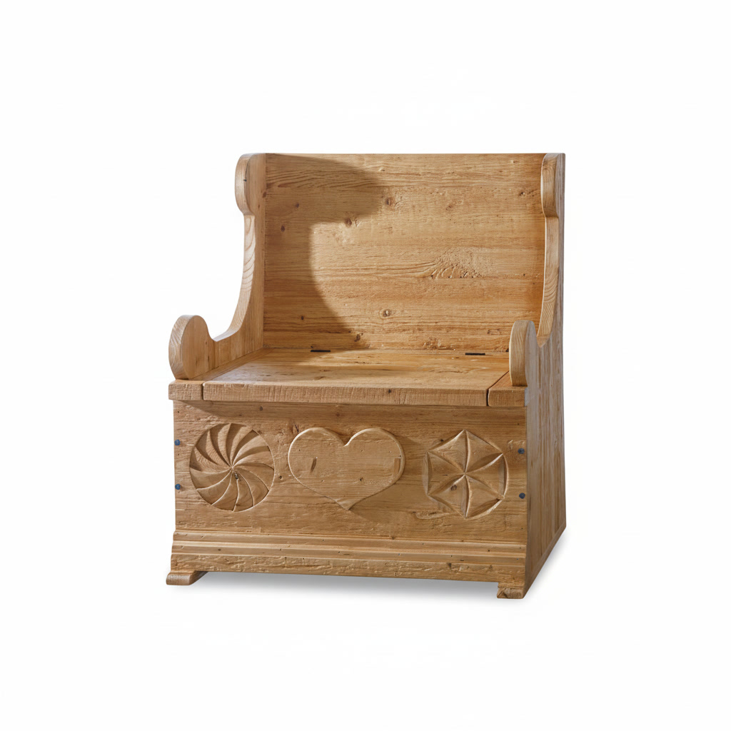 This distinctive armchair is crafted from 100% solid pinewood, combining traditional Alpine design with practical functionality. Beneath the seat, an integrated storage compartment offers discreet space, reminiscent of a classic wooden chest. The front panel is enriched with hand-carved Alpine motifs, while the aged surface treatment enhances the natural grain and character of the wood. With its robust construction, comfortable proportions, and multifunctional design, this armchair is a refined accent piece that brings warmth, authenticity, and enduring craftsmanship to any interior.