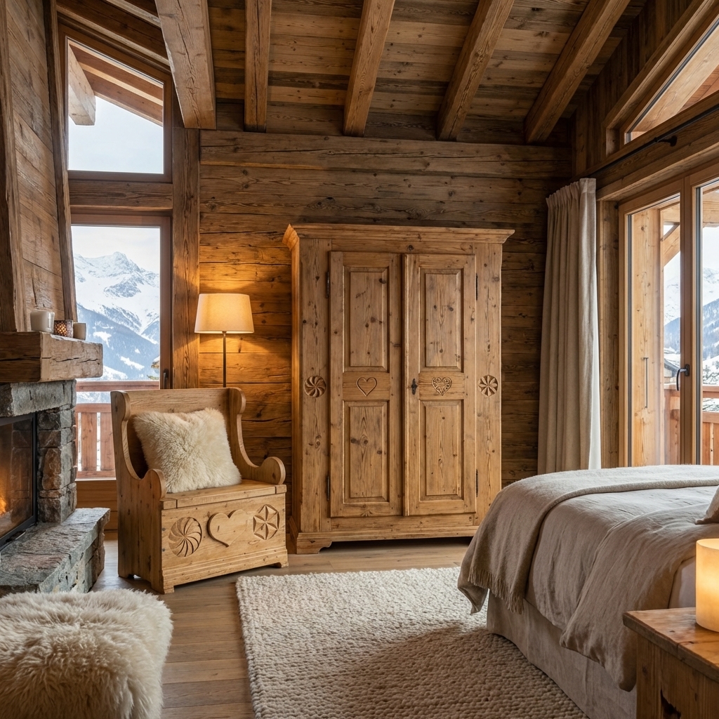The collection’s design language is rooted in authentic Alpine style, featuring hand-carved motifs and decorative elements traditionally found in mountain chalets. These details are not merely ornamental; they express a way of life associated with warmth, natural materials, and enduring quality. The result is furniture that brings the atmosphere and emotional comfort of Alpine living into contemporary interiors.