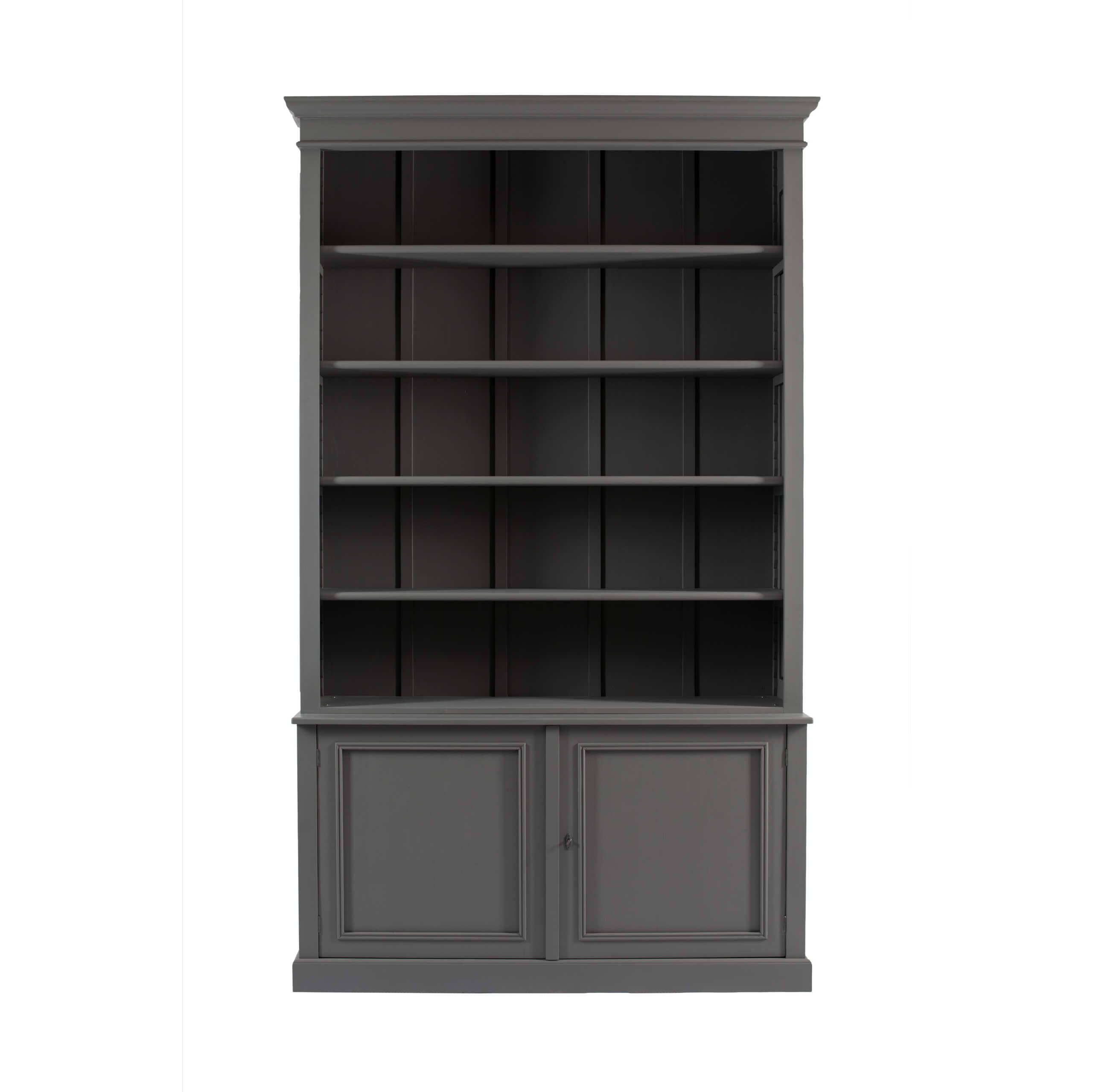 This stately bookcase, painted in a rich slate grey, brings quiet sophistication and balance to the room. With open shelving above and paneled doors below, it offers the perfect blend of display and hidden storage. The upper shelves showcase books, ceramics, and art pieces beautifully against the dark backdrop, which adds depth and warmth to the space. Classic moulding details and solid craftsmanship give it a timeless, heritage-inspired appeal. Ideal for studies, living rooms, or reading nooks, this piece anchors the room with understated elegance and character.