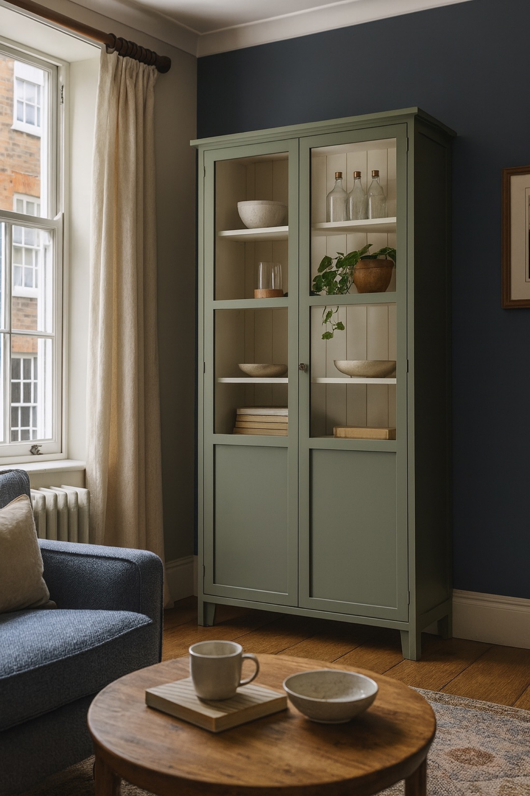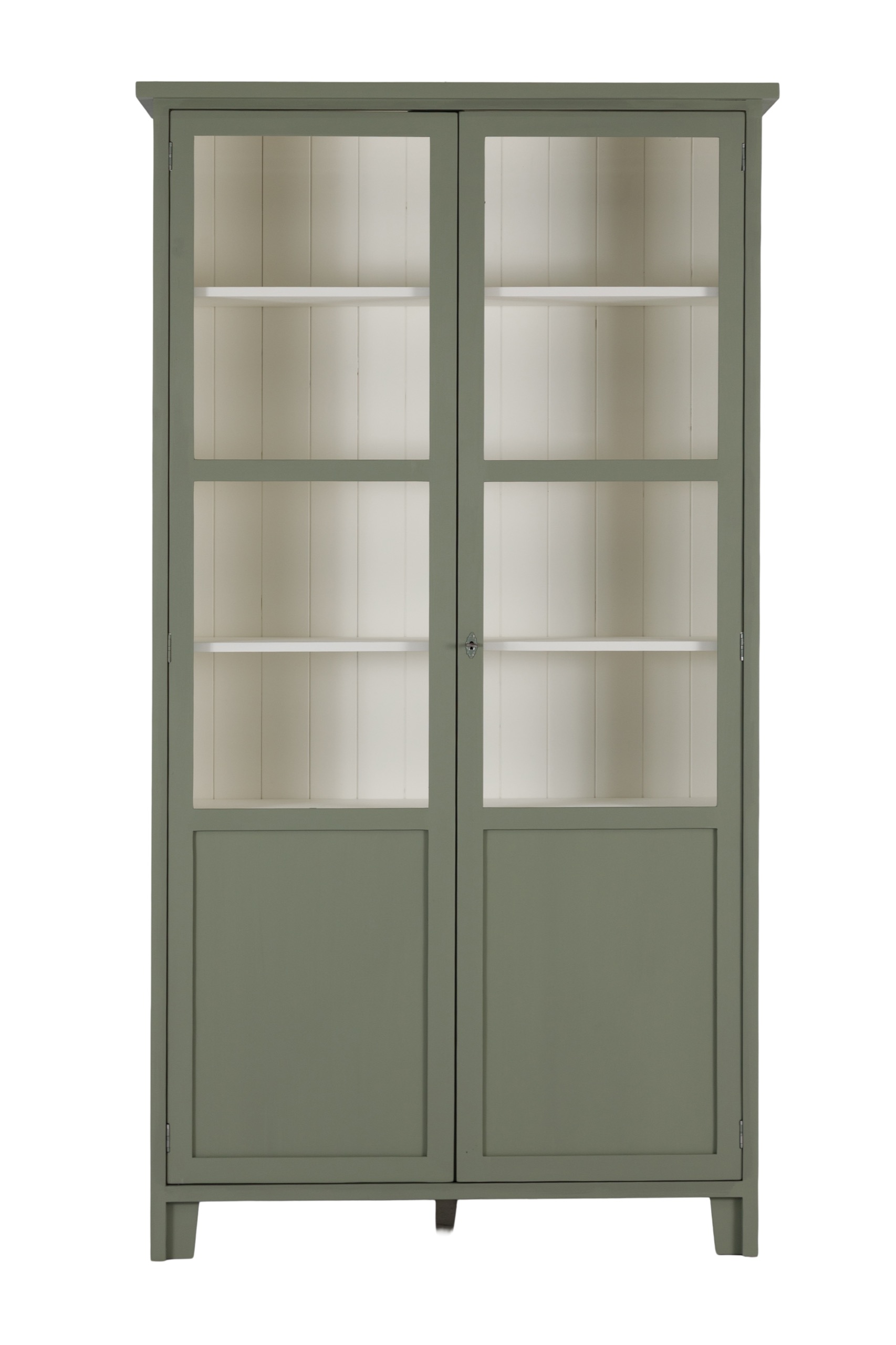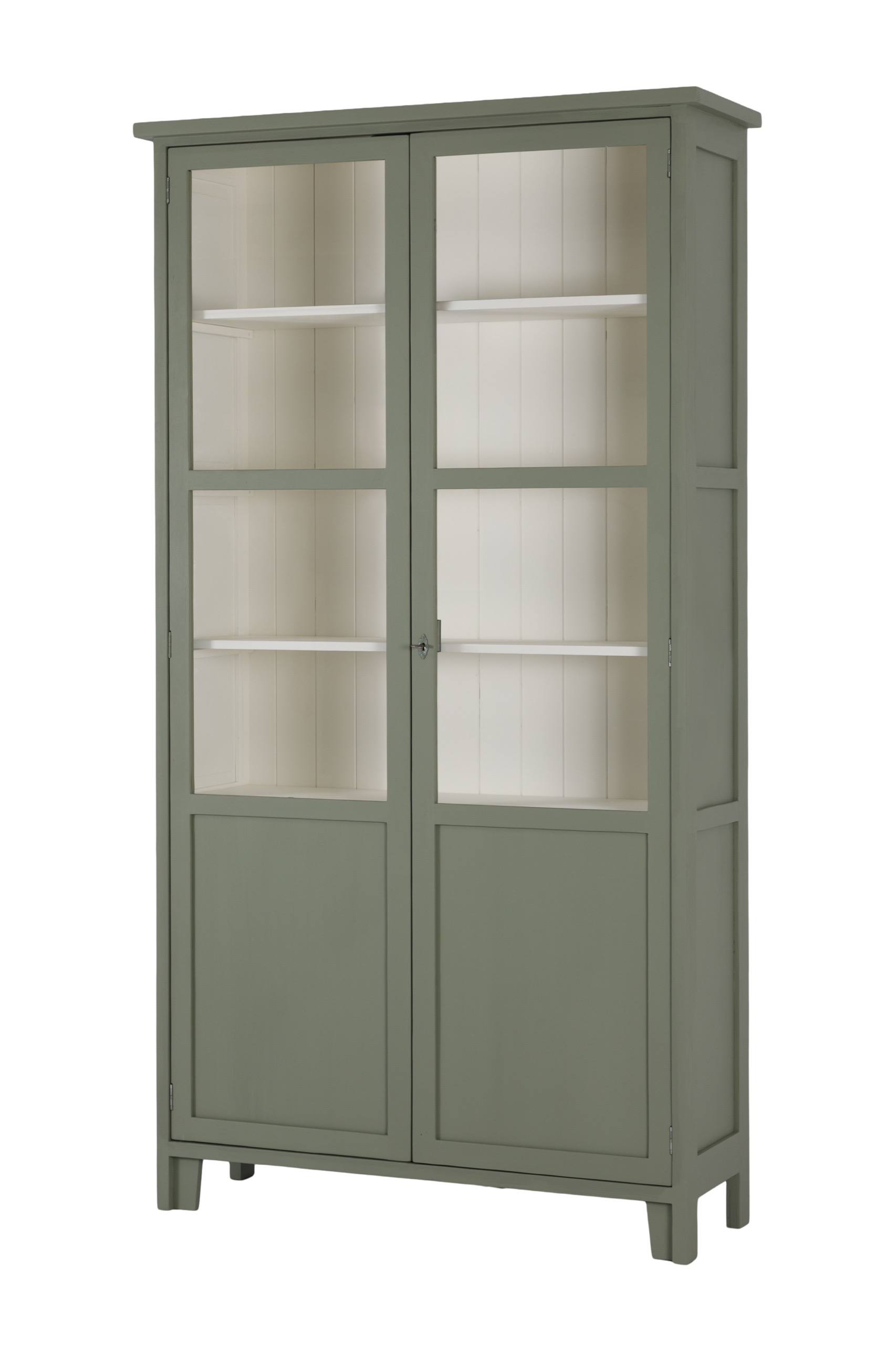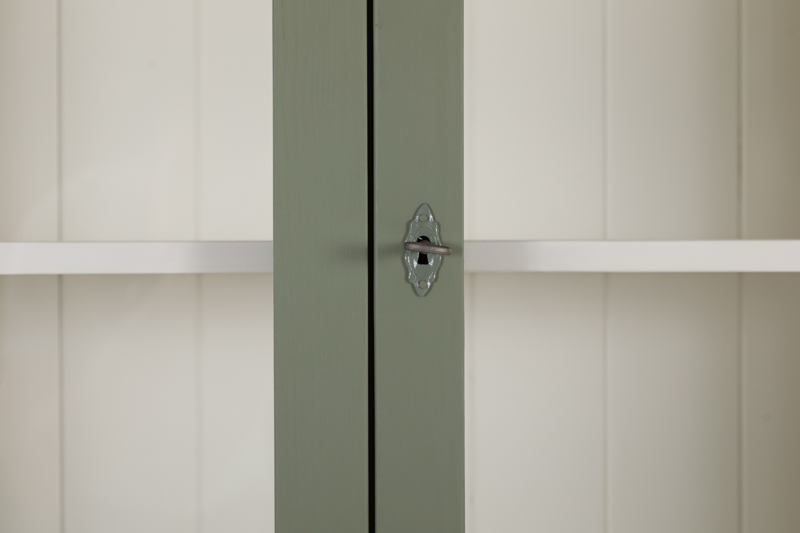 This beautifully crafted cabinet blends classic design with modern simplicity. Finished in a calming sage green, it features glass-panelled doors that showcase your favourite ceramics, glassware, or books with elegance. The interior is softly contrasted in a light tone, enhancing the warmth and depth of the display. Clean lines and subtle detailing make it versatile enough for both traditional and contemporary interiors. Perfect for living rooms or dining spaces, this cabinet adds a touch of timeless charm and natural sophistication to your home.