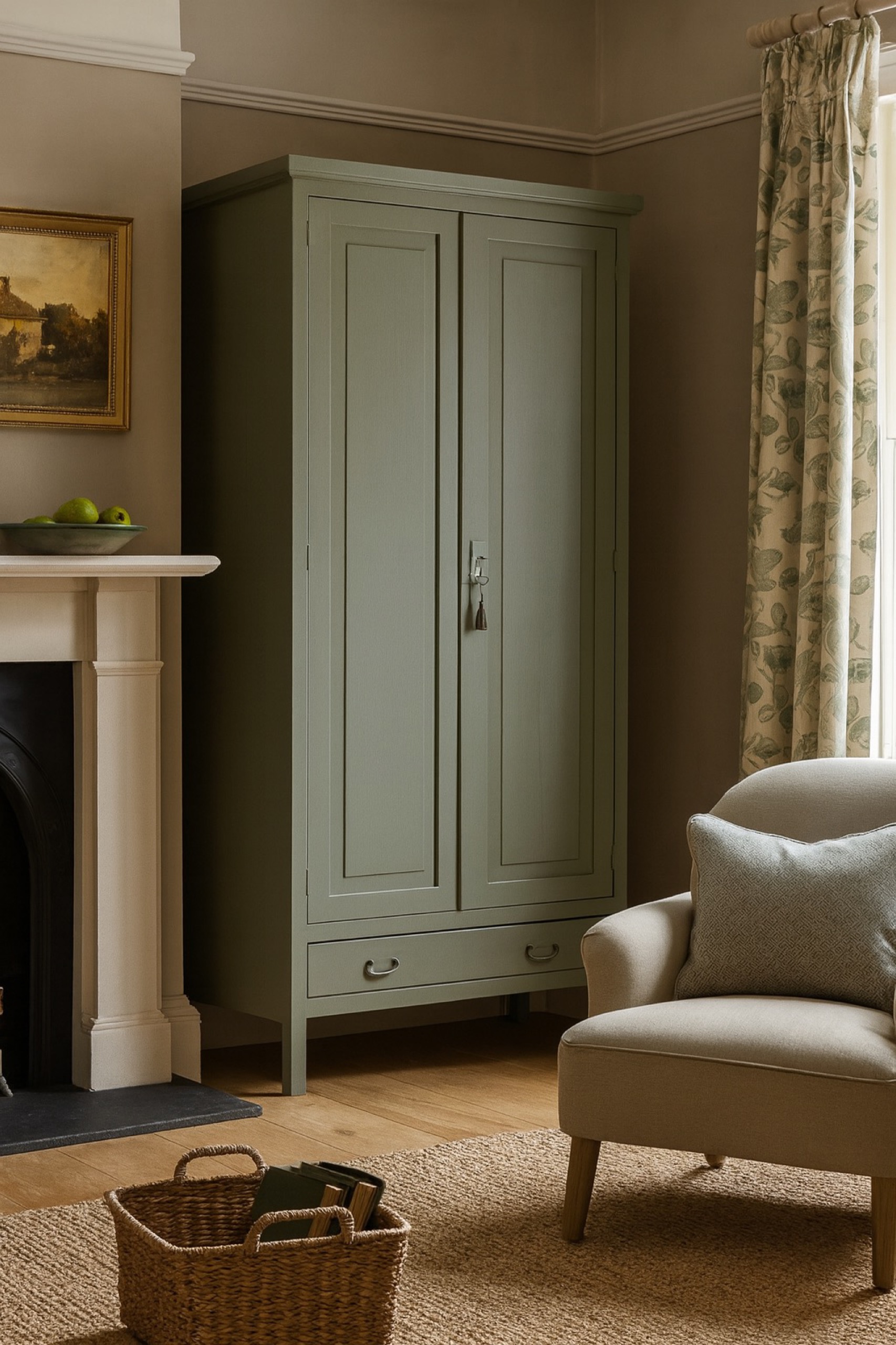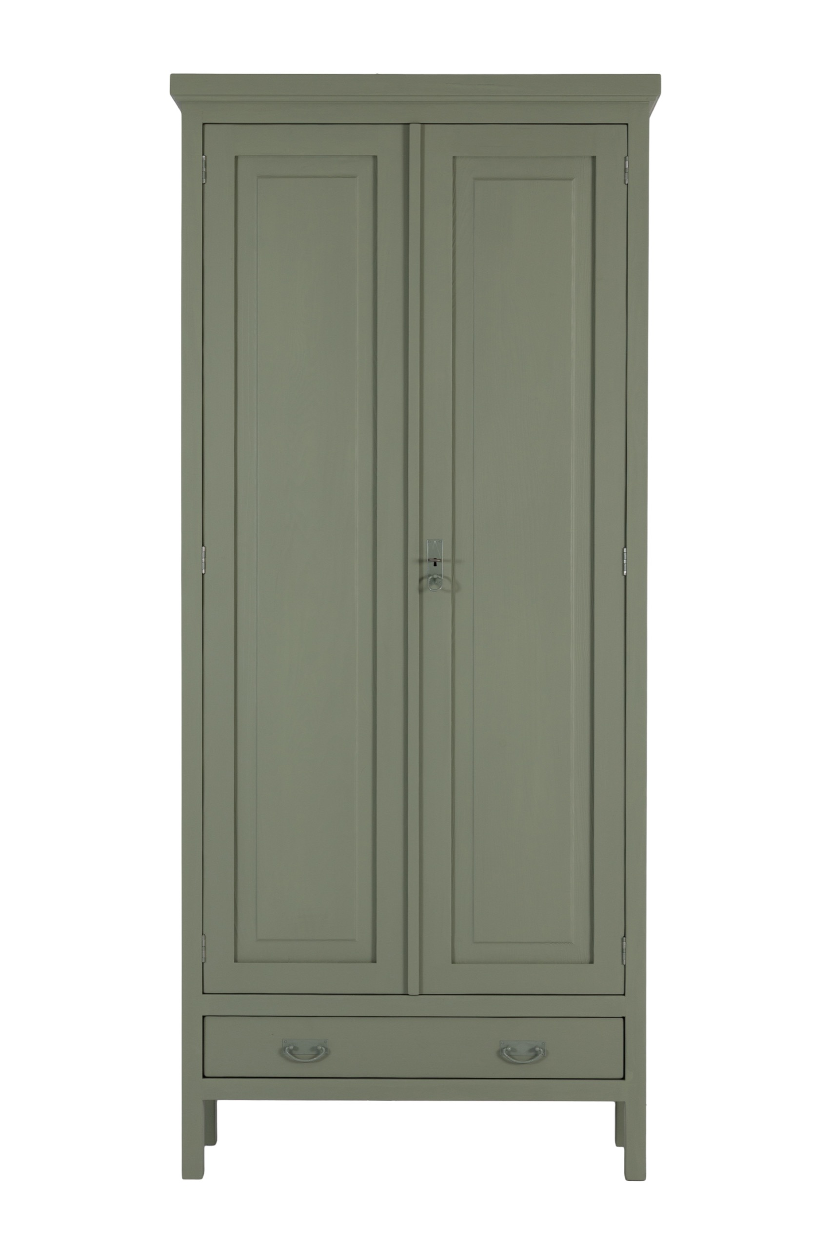 This elegant wardrobe combines traditional charm with understated sophistication. Finished in a soft sage green, it brings a calm, natural feel to the room while offering practical storage behind its paneled doors. The lower drawer provides additional space for linens or accessories, complemented by classic metal handles for a refined touch. Crafted with attention to detail, its timeless silhouette fits beautifully into both modern and country-inspired interiors. A perfect blend of beauty and functionality, this wardrobe enhances any bedroom or guest space with effortless grace.