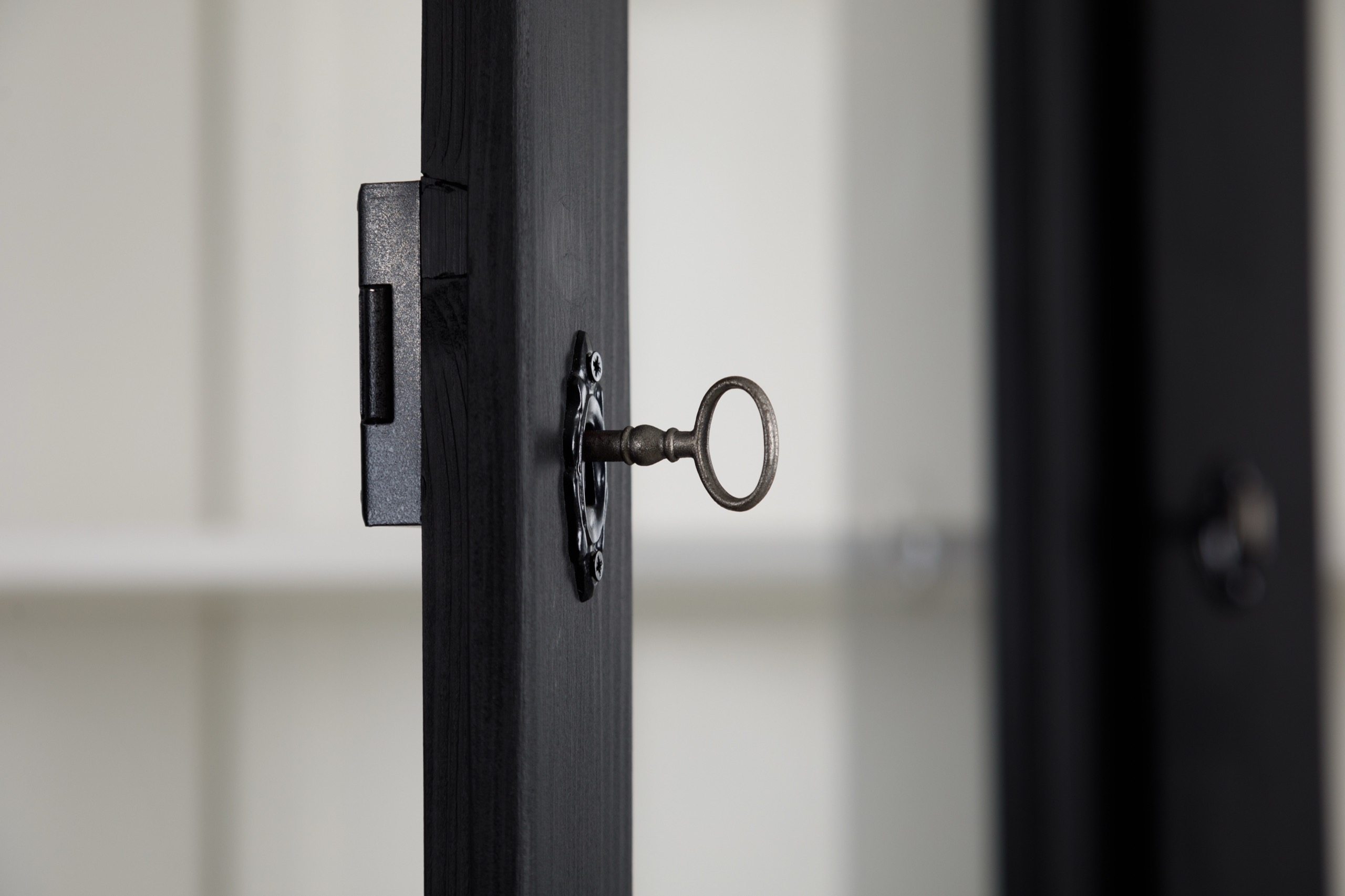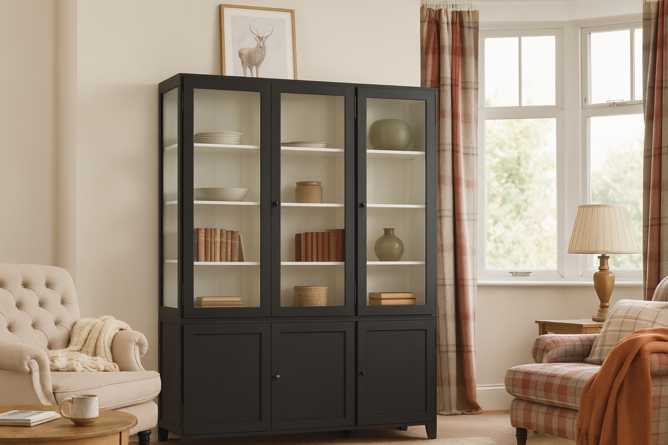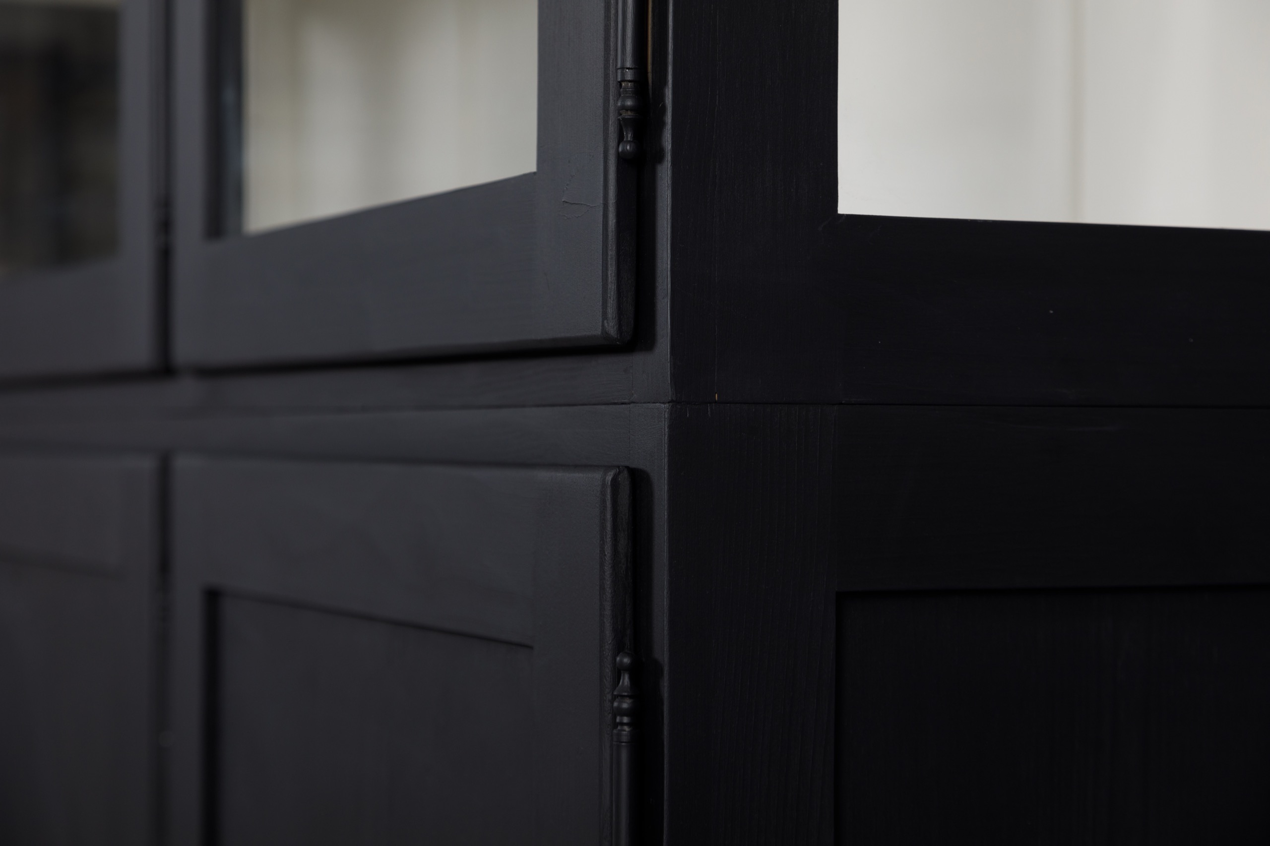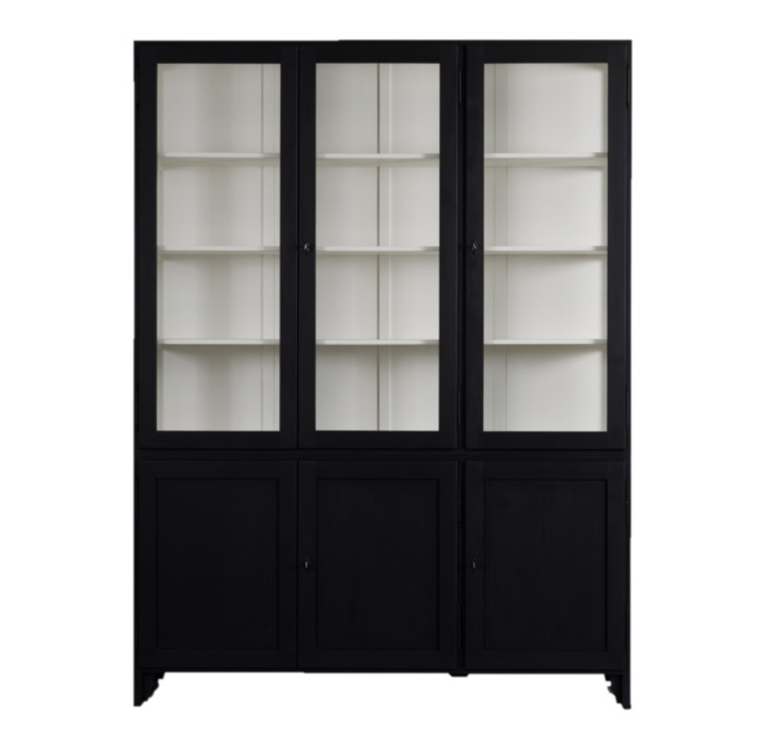 This elegant display cabinet brings a touch of modern sophistication to any interior. Its deep black frame contrasts beautifully with the bright white interior, highlighting everything from books and ceramics to curated décor pieces. The upper section features glass doors that create an airy, open feel, while the lower cupboards provide discreet storage for everyday essentials. Clean lines and minimalist knobs lend it a contemporary yet timeless character. Perfect for living rooms, dining spaces, or studies, this cabinet adds both functionality and refined style to your home.