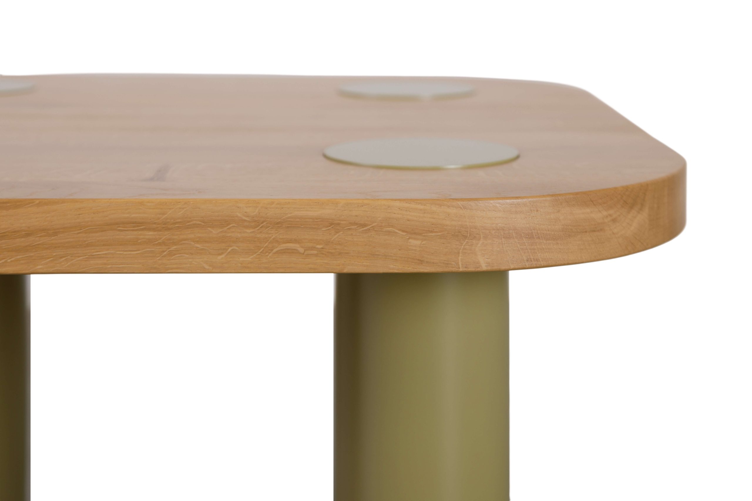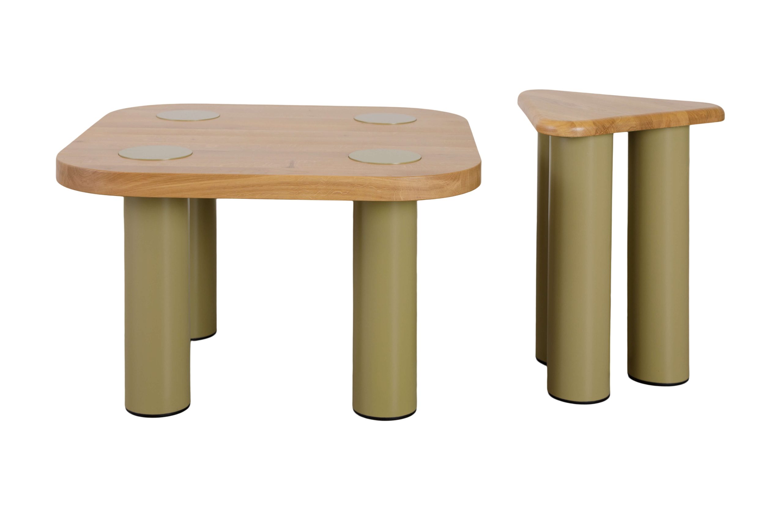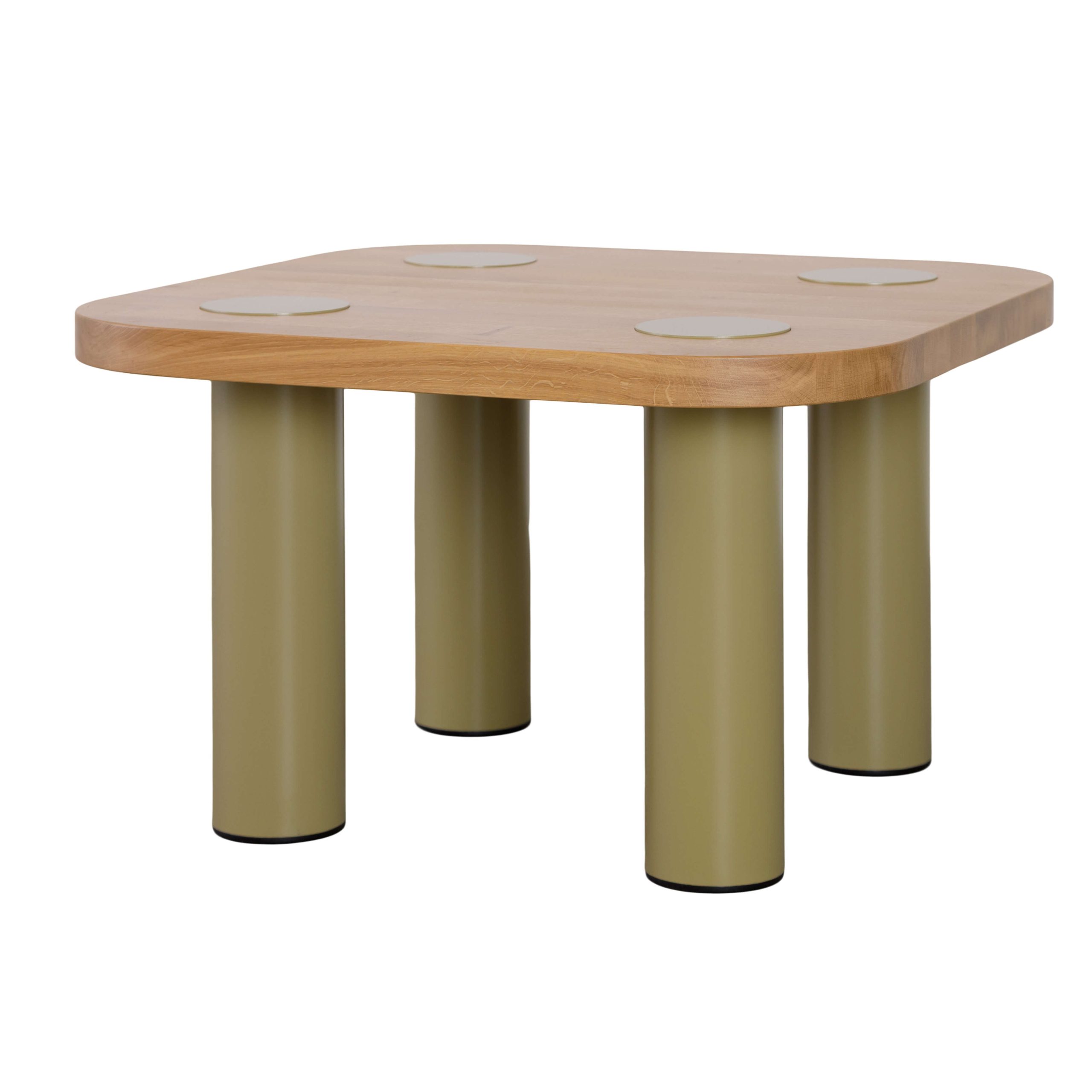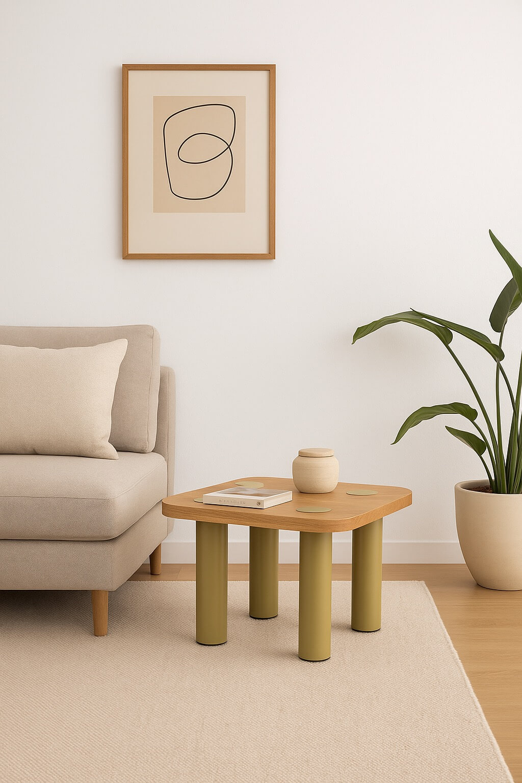 This modern low table blends a solid oak top with bold, cylindrical metal legs in a warm olive tone. Its rounded square shape and soft edges create a cozy, contemporary look perfect for Scandinavian and Japandi interiors. The natural wood grain adds warmth, while the matte metal base brings a fresh, sculptural character to the room. Ideal as a coffee or accent table, it offers both visual appeal and everyday practicality. A stylish statement piece that effortlessly enhances calm, minimalist spaces.